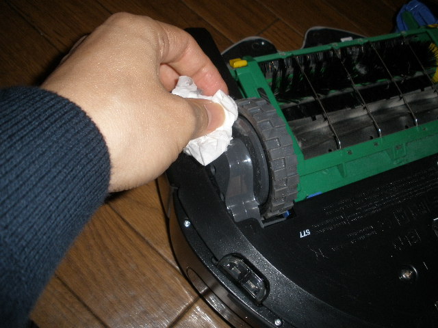 | タイヤに付いたほこりを拭きます。タイヤの動きが悪いと、電気量が余計に必要となるので、よくふき取ります。 |