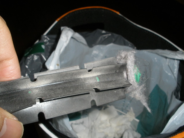 | こちらのブラシにも糸くずと髪の毛が巻きついています。巻きつきすぎたままだと、回りが悪くなり、効率が悪くなるので、たまに掃除しましょう。 |